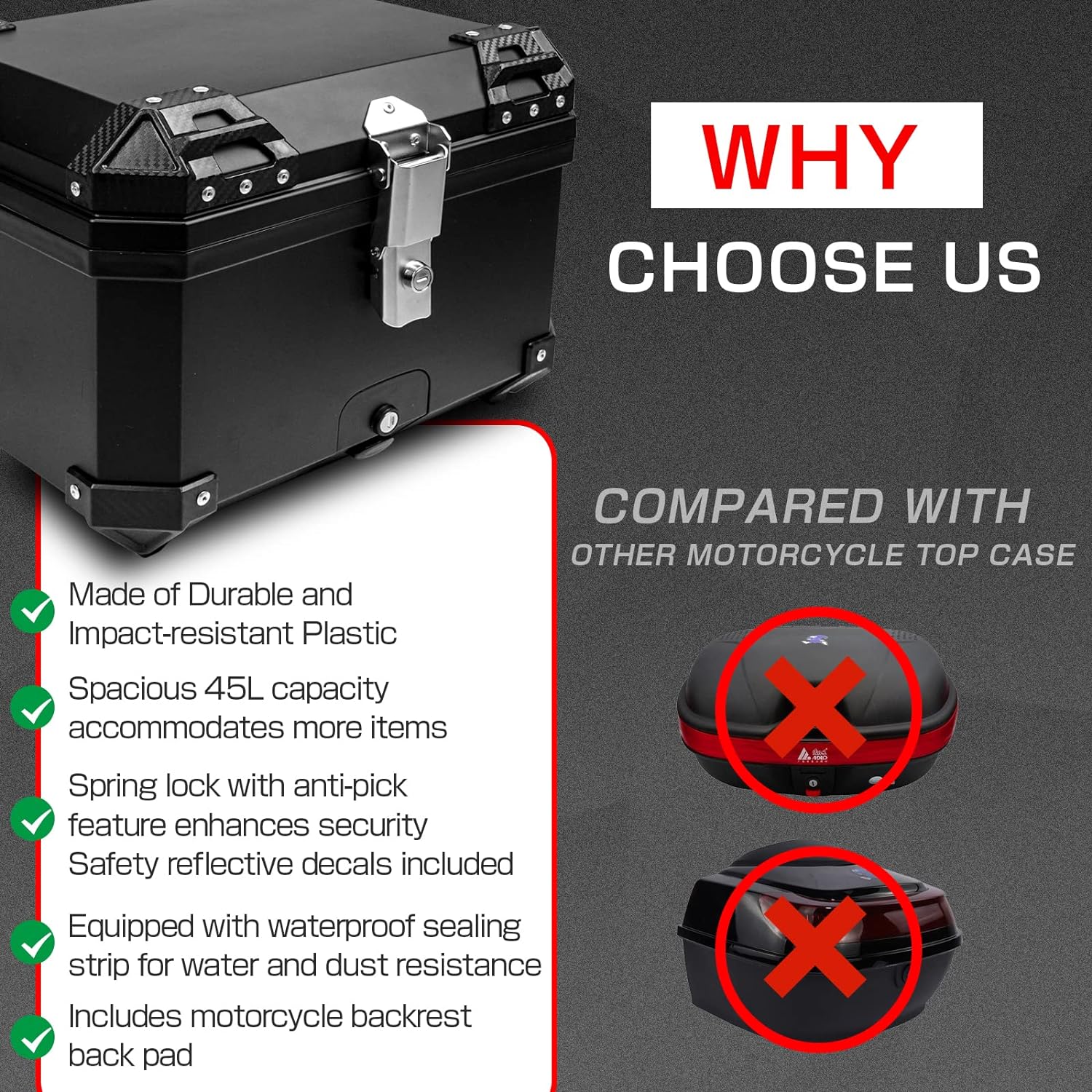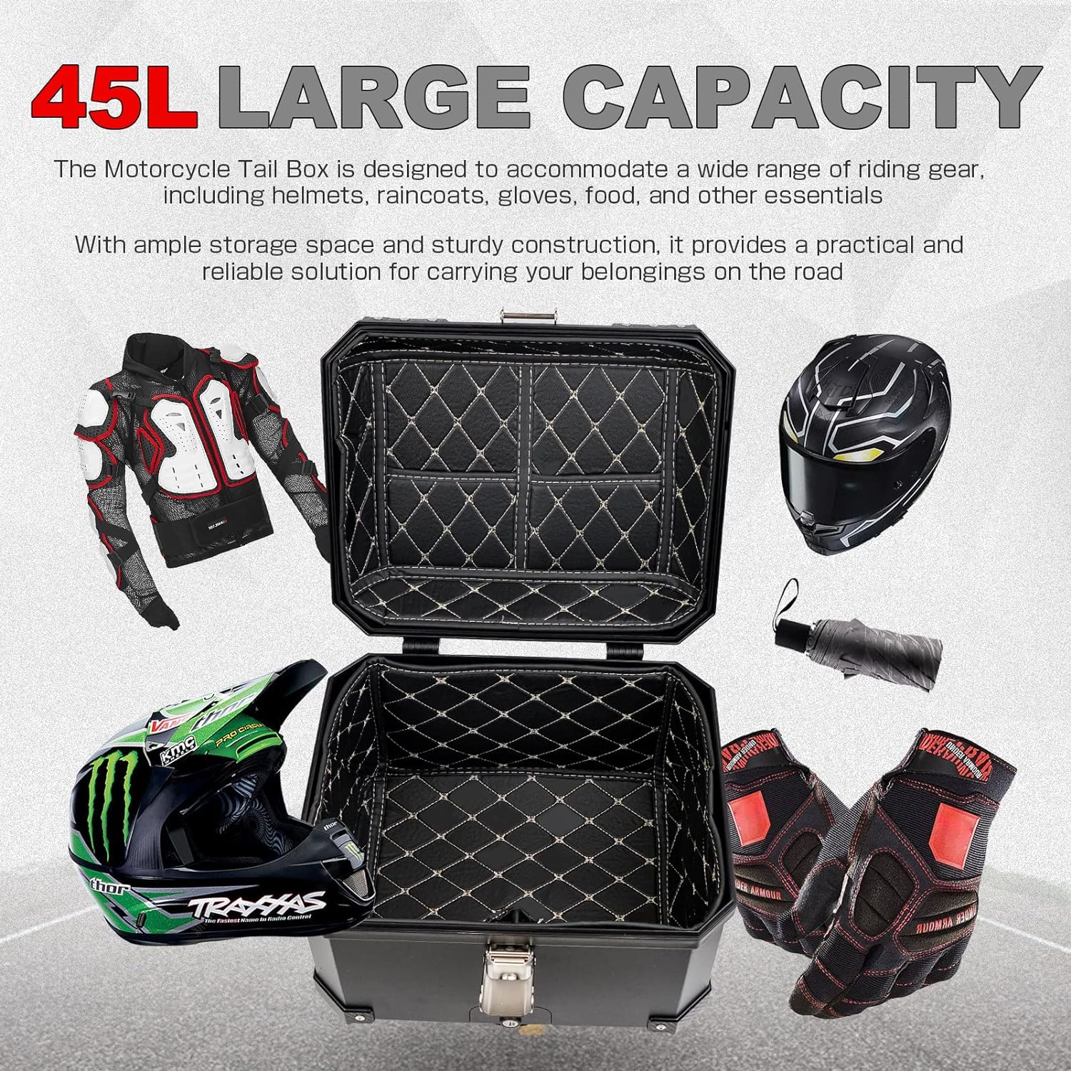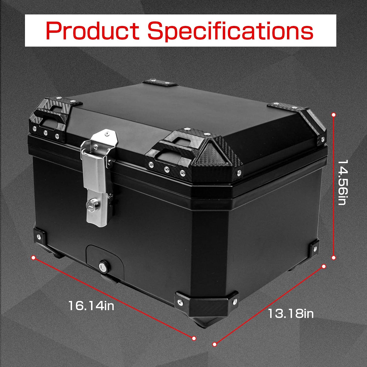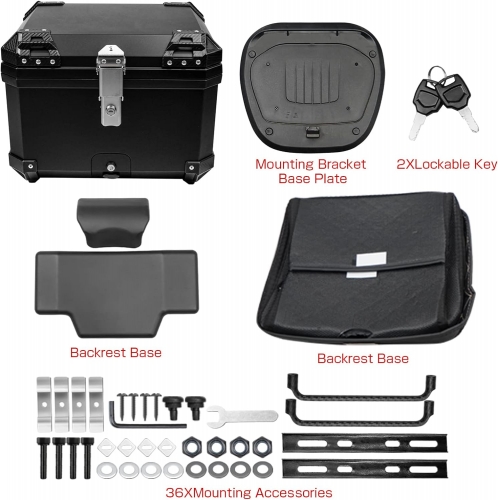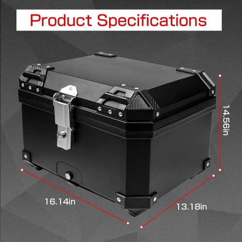 【Spacious 45L Motorcycle Trunk】This motorcycle storage box provides all-day weather resistance and boasts an excellent storage system, allowing you to easily store more items. With a large 55L capacity, it can accommodate clothes, shoes, helmets, and more, making it a great travel trunk. It comes with a security lock to prevent theft and can be installed in almost all motorcycle models. (Dimensions: 16.14"L x 13.18"H x 14.56"W)